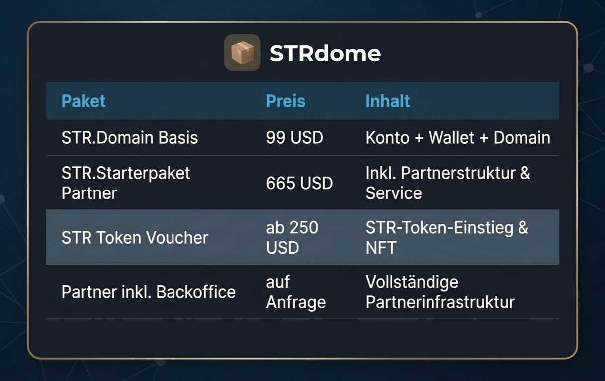 Ergänzende ökonomische Ebene durch STR-Token und Systemerweiterungen. Als Partner hast du die Möglichkeit, dich frühzeitig am STR-Token zu beteiligen und damit nicht nur am Vertriebserfolg, sondern am Wachstum des gesamten Netzwerks zu partizipieren.