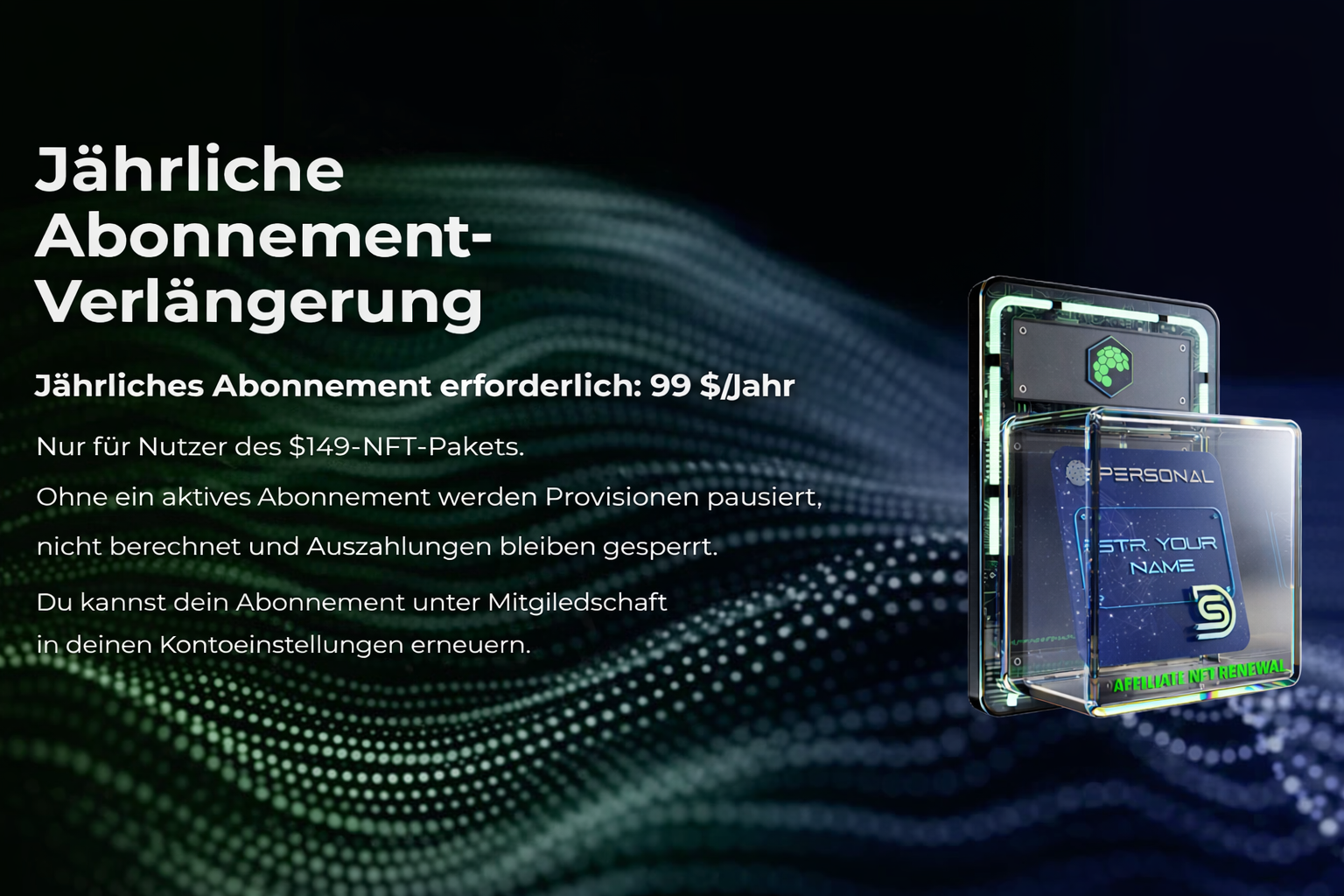 Tipp: Starte mit dem Affiliate NFT (€149), wenn du testen möchtest. Upgrade später zum Starter Package, wenn du wachsen möchtest